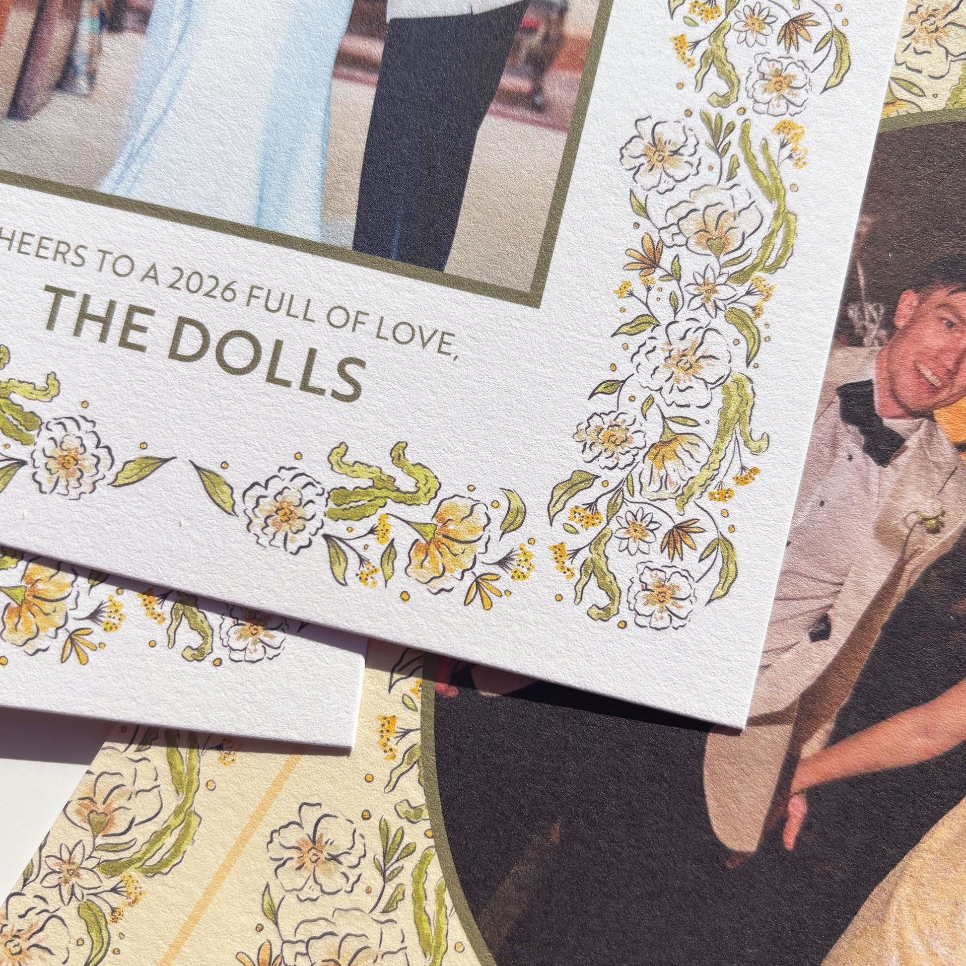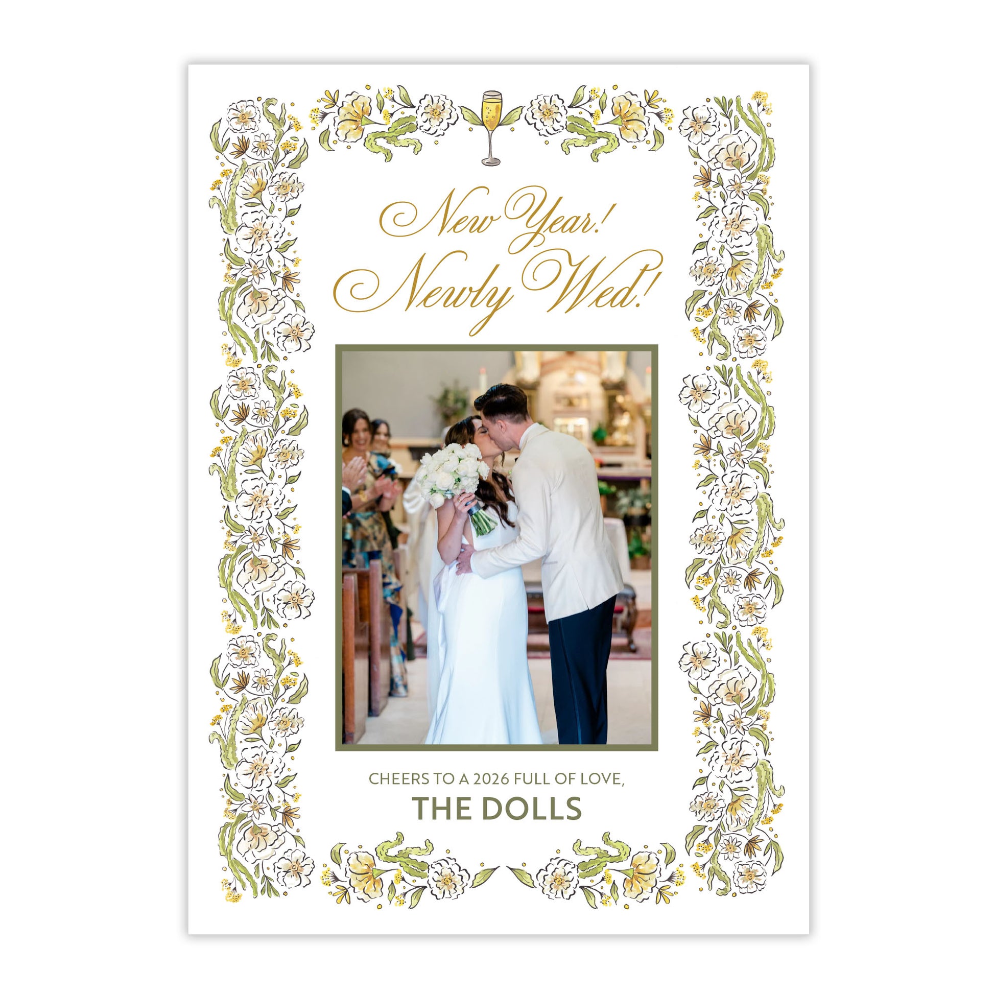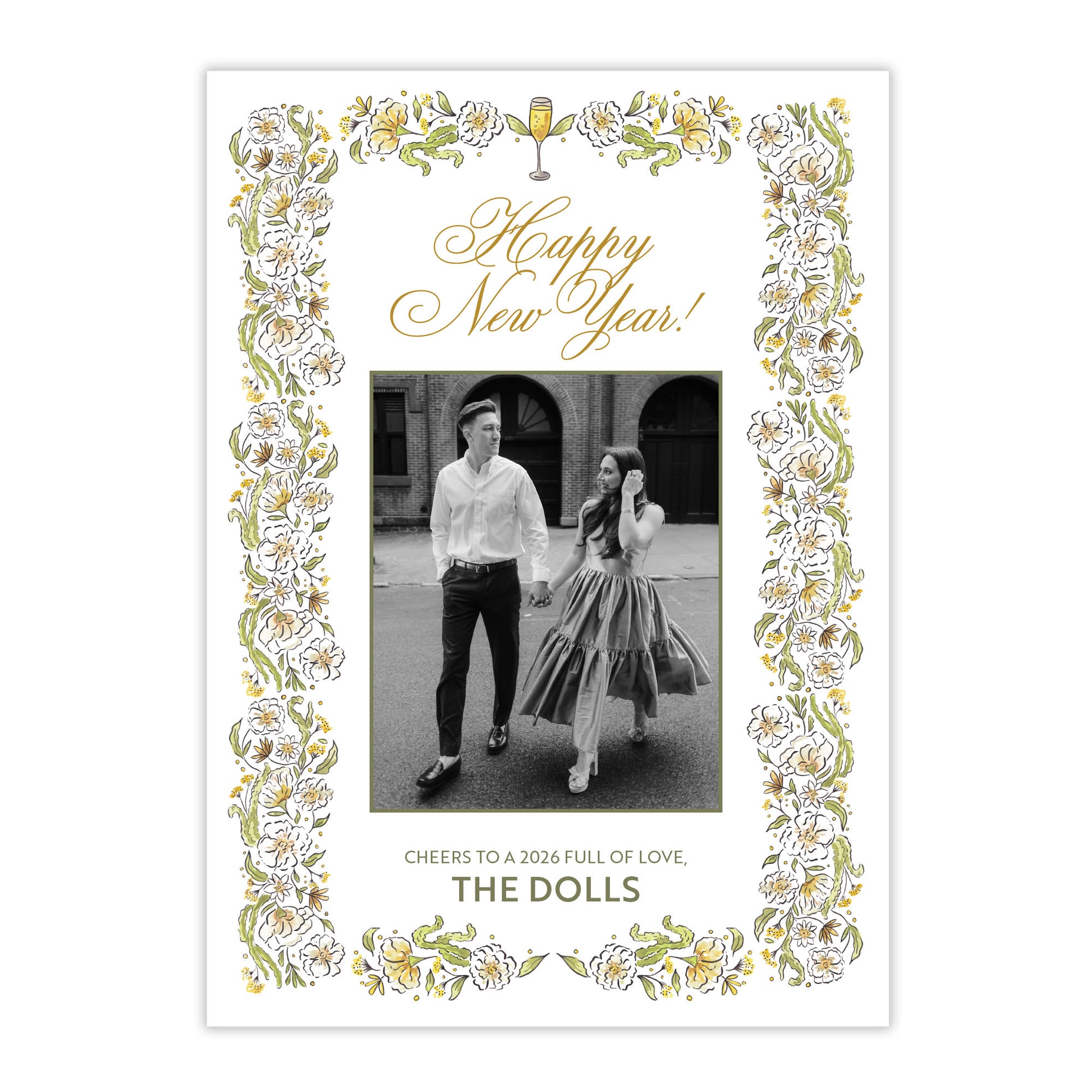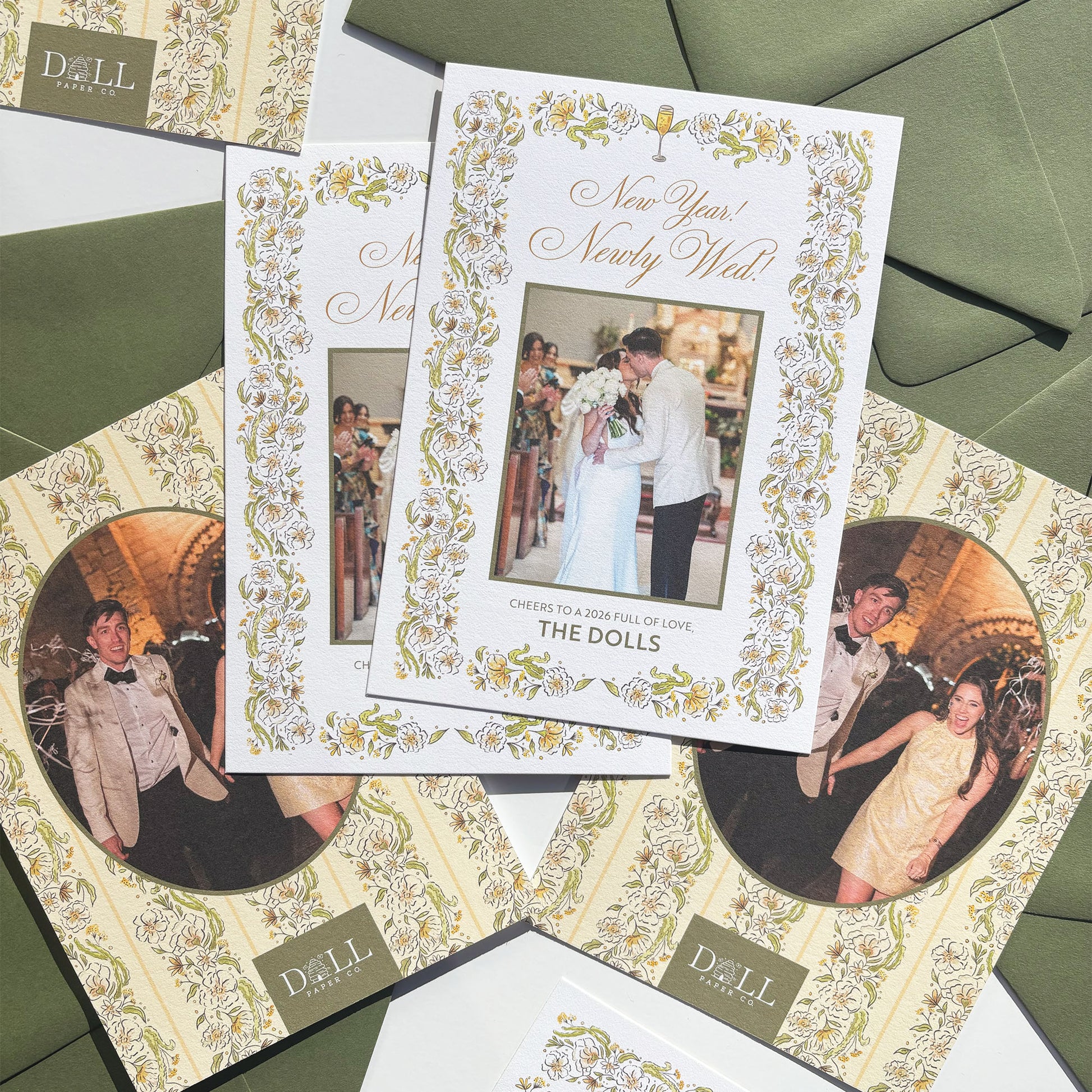 Send a little NYE sparkle with our chic Cheers to Forever New Year’s cards, adorned with vintage-inspired florals, champagne accents, and warm golden tones. Perfect for ringing in the new year with style, these cards are especially fitting for newlyweds celebrating their first New Year as a married couple — but they can just as easily be customized for families and friends who want a festive, elegant way to welcome 2026. ✨🍾
